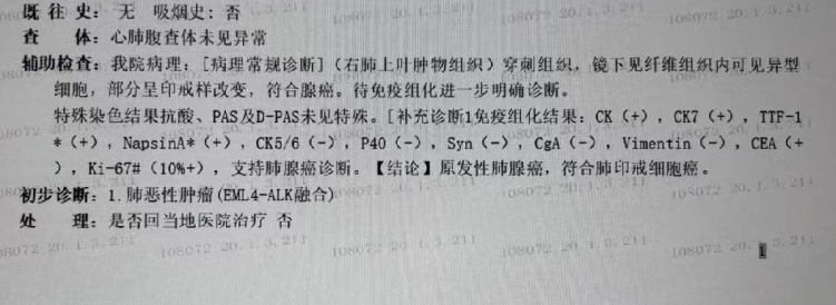 幸运的是,病理提示EML4-ALK融合突变——肺癌里公认的“钻石靶点”,已有完整的靶向药物谱系可选。综合影像学等综合评估后,患者最终决定使用ALK抑制剂伊鲁阿克进行治疗。