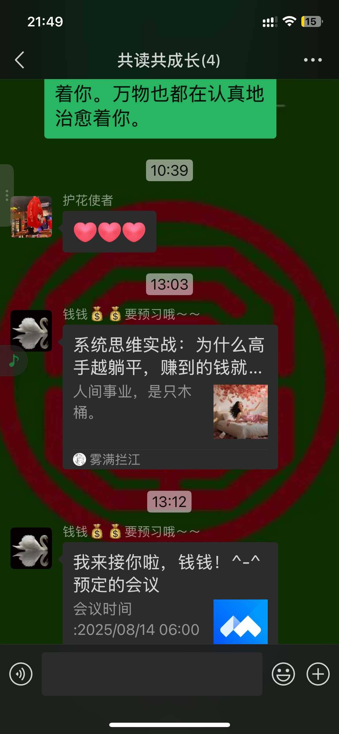 我们这几个人素不相识,但每人身上都有可学习的地方,哪怕每天只有一个伙伴参加,我就会坚持和她共读下去。