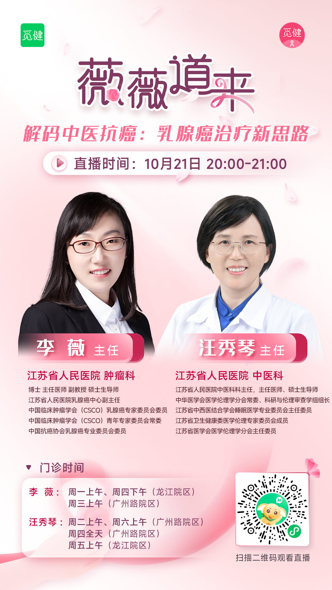 亲爱的觅友们,今天的第十五期的【薇薇道来】直播,嘉宾是江苏省人民医院肿瘤科乳腺中心李薇教授。我们主要整理了大家关心的这些问题: