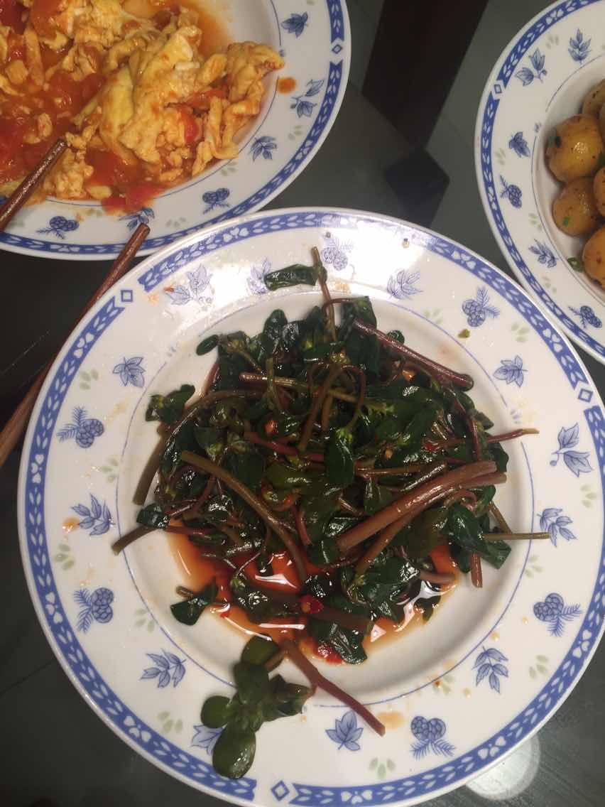 马齿苋,很好的野菜,我晚上也有这道菜,凉拌。加糖、酱油、麻油、李锦记桂林辣酱,味道很好