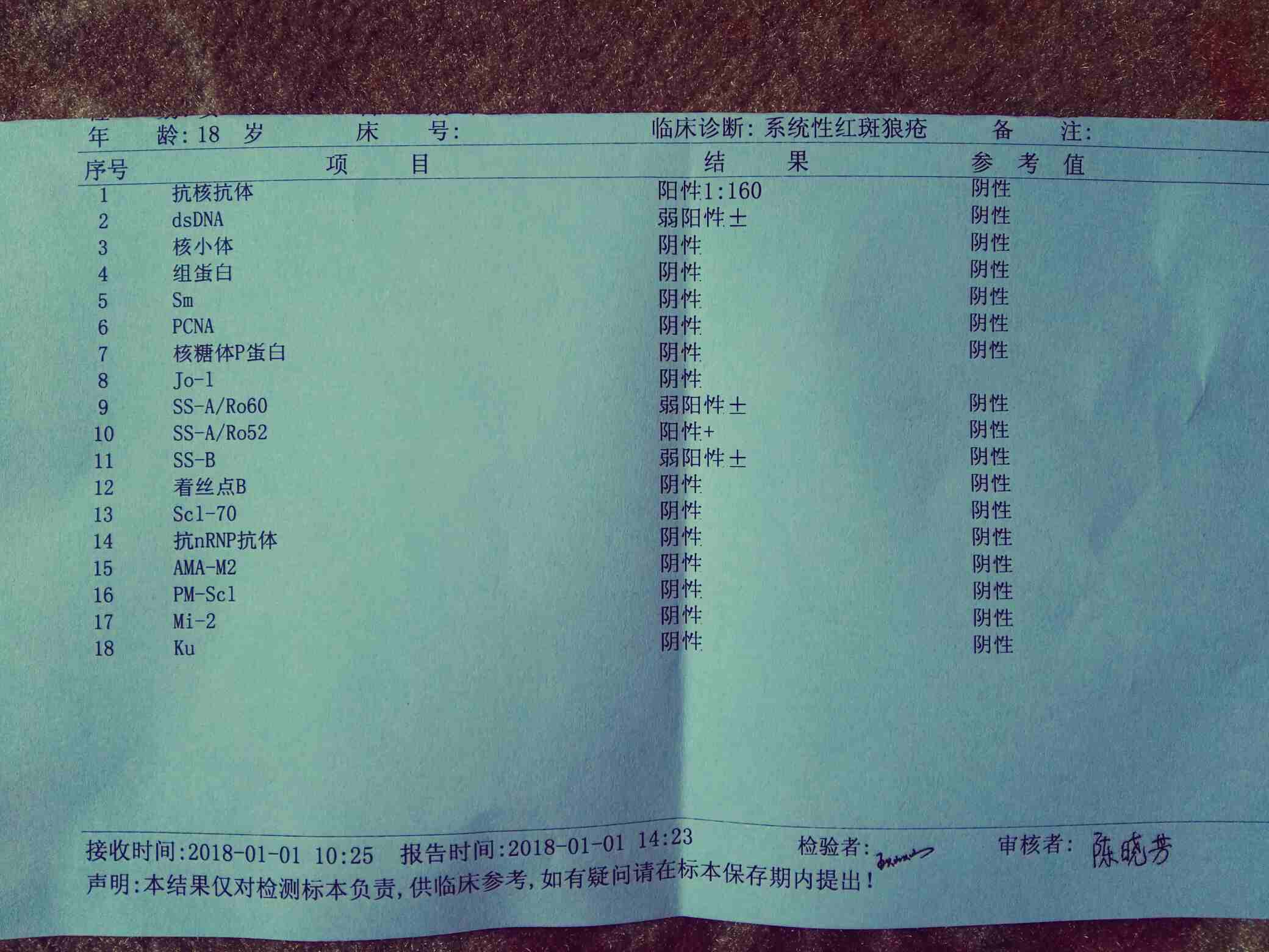 一大早,跟老公一起去医院拿女儿的检查报告单,每一次去拿前的心情就像接受判决一般的忐忑不定,幸亏结果不错,特别抗核抗体从1:320降到1:160,还有阳性也少了两个,当时我们夫妻俩互相鼓励,相信2018年孩子恢复会更好!