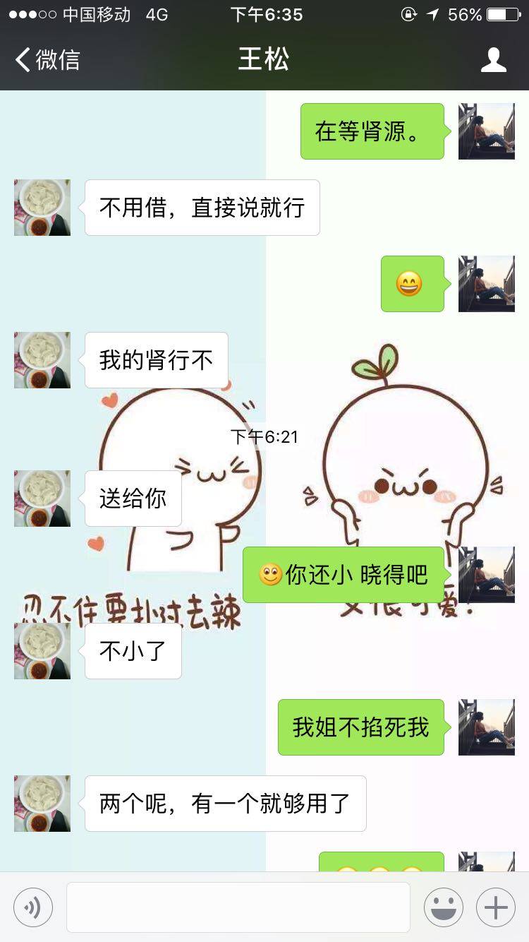 我表姐的儿子。我表姐的妈妈也就是我大姨妈,是最大的,而我妈妈最小。侄儿子是东北汉子。因为大姨和我妈的年龄差距,导致我的侄儿子都比我大。今天突然找我,就说要把他的肾给我,不管出于真心还是客气,好吧,我都感动了。