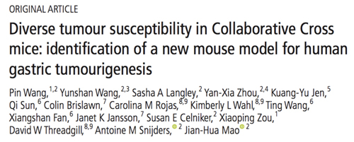 3月7日,南京鼓楼医院消化内科邹晓平教授团队成员之一王频博士与美国劳伦斯伯克利国家实验室的Jianhua Mao、Antoine Snijders博士等共同在国际顶尖消化病学期刊GUT上在线发表了题为“Diverse tumour susceptibility in Collaborative Cross mice: identication of a new mouse model for human gastric tumourigenesis”的原创论文,报道了他们在国际上首次发现的自发性胃癌高发小鼠模型CC036, 并在此基础上初步探究了CC036胃癌易感性潜在分子机制,为胃癌基础及临床研究提供了优质的技术平台。
