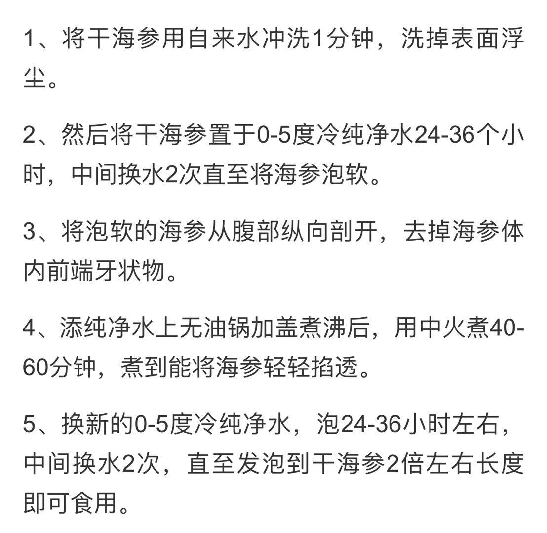 一.将干海参洗净.放入冰水中浸泡48小时(放冰箱保鲜冷藏.水加足点.其间6小時换一遍水)二.将海参顺嘴剪口开膛.去掉沙嘴.洗净将海参下锅小火煮2o分钟关火盖锅盖热焖5-8小時.用自来水冲凉洗净放入冰箱中冷藏浸泡12个小时左右三.将海参清洗净软硬合适的挑出.将偏硬的海参放入无油锅内煮开.关火.盖锅盖30分钟左右挑一遍软硬合适的挑出.硬的继续煮开.关火.盖锅盖.闷2至3个小时.软硬基本就都可以了.个別硬的再煮一煮,待每条海参都煮好!加纯净水放冰箱冷藏`每24小时换纯净水一次,换三到四遍纯净冰水,海参就泡发成功了!海参泡发的出成率多少`和质量取决于第二次煮参的手感软硬!如果不太理想在手感软硬上调一下就可以了:其它环节不用变化!