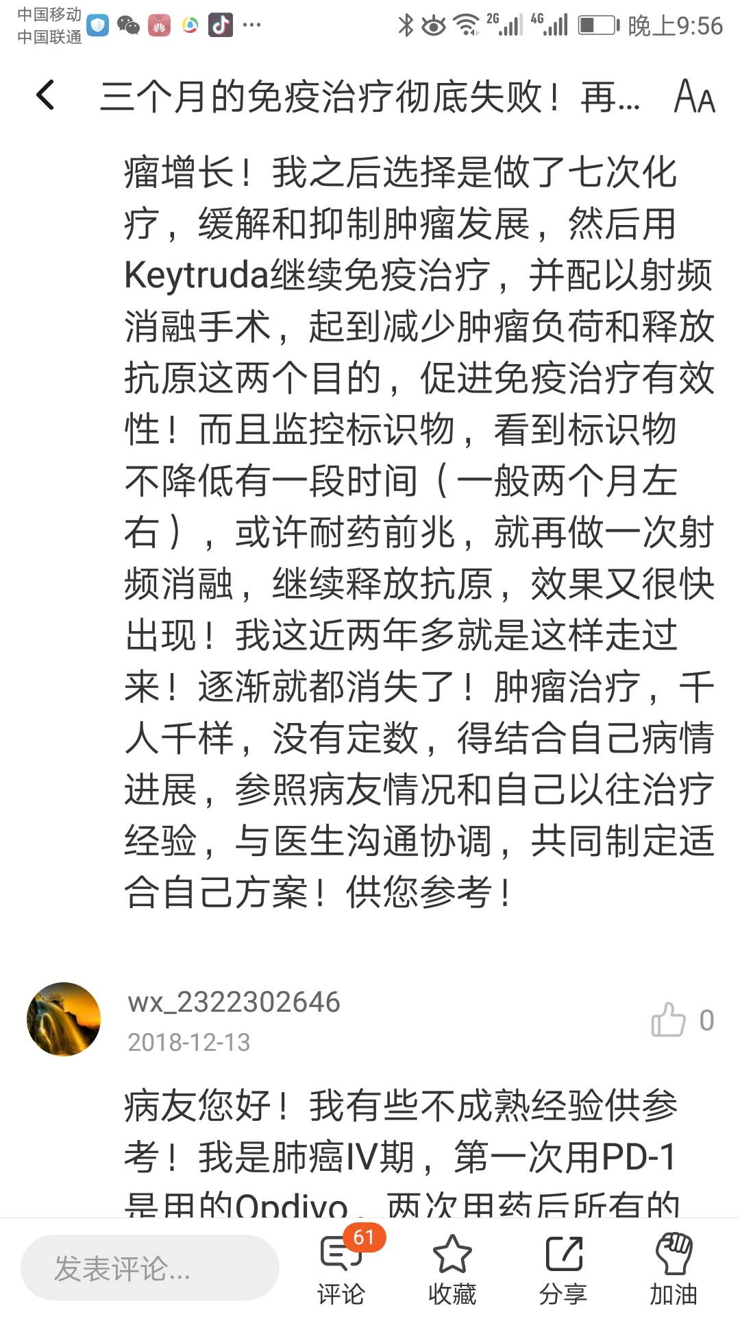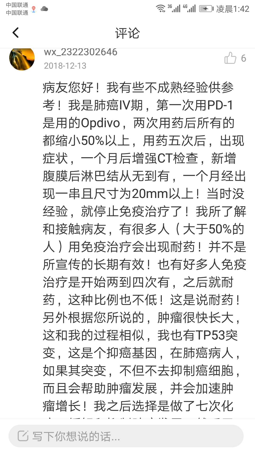 貌似记得看过谁说,同样的是免疫治疗,o药和k药的效果不一样。毕竟表达有那么高,是不是这个原因呢?之前缩小是因为化疗的原因。而且本来免疫起效就慢?不懂,我瞎想的哈。现在只要能稳定也是很好的现象,加油