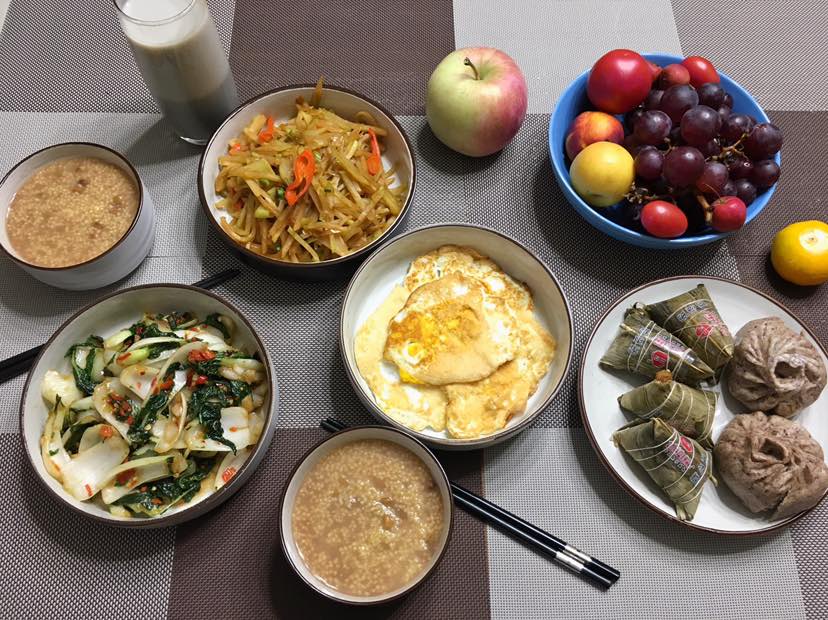 早餐:炒油菜/炒丕蓝/煎土鸡蛋/黑豆浆/杂面菜包/粽子/小米绿豆粥/水果拼盘