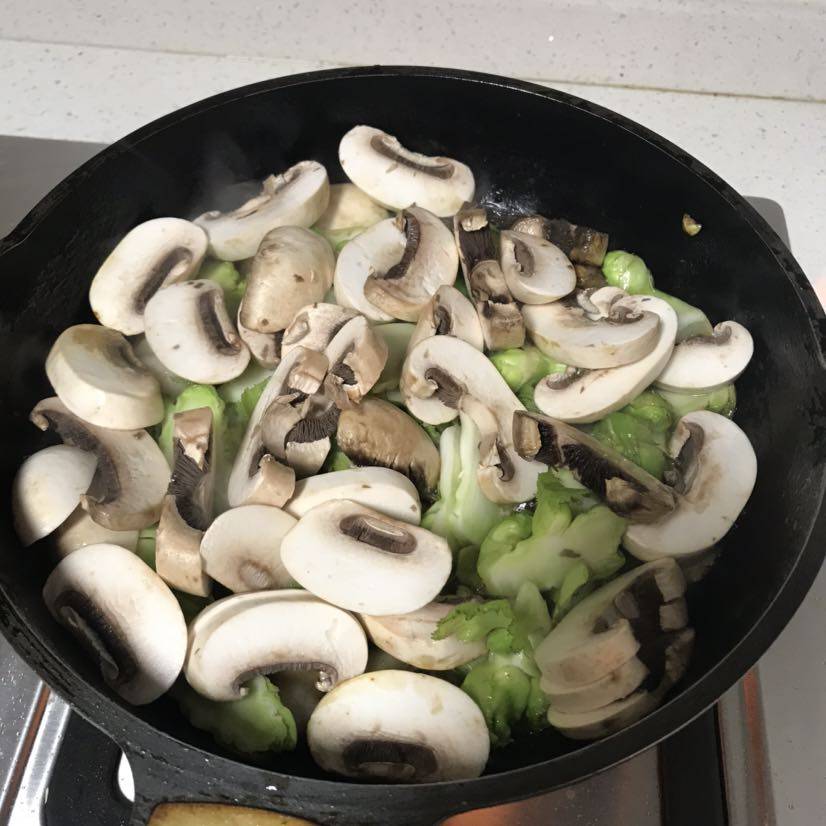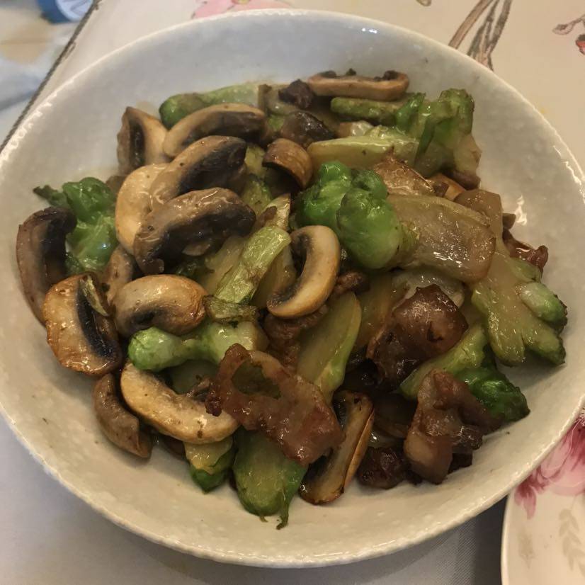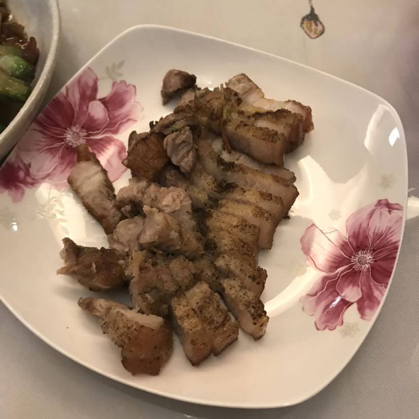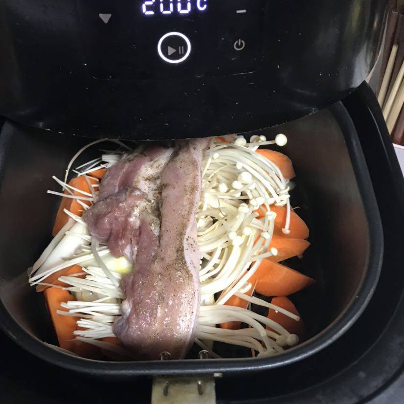 我自己切了条五花肉,半条用盐油,胡椒粉腌了,放空气炸锅烤了,再切了点,与蘑菇娃娃菜一起炒了,配了小碗米饭。。