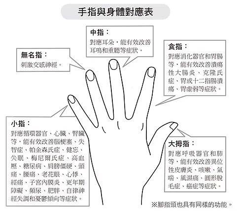 ※用大拇指与食指,抓住另一手手指头上长出指甲的地方两侧,然后开始揉搓,一处约揉搓10秒钟。可参照手指与身体对应表,有任何不适症状的人,最好揉搓20秒钟。