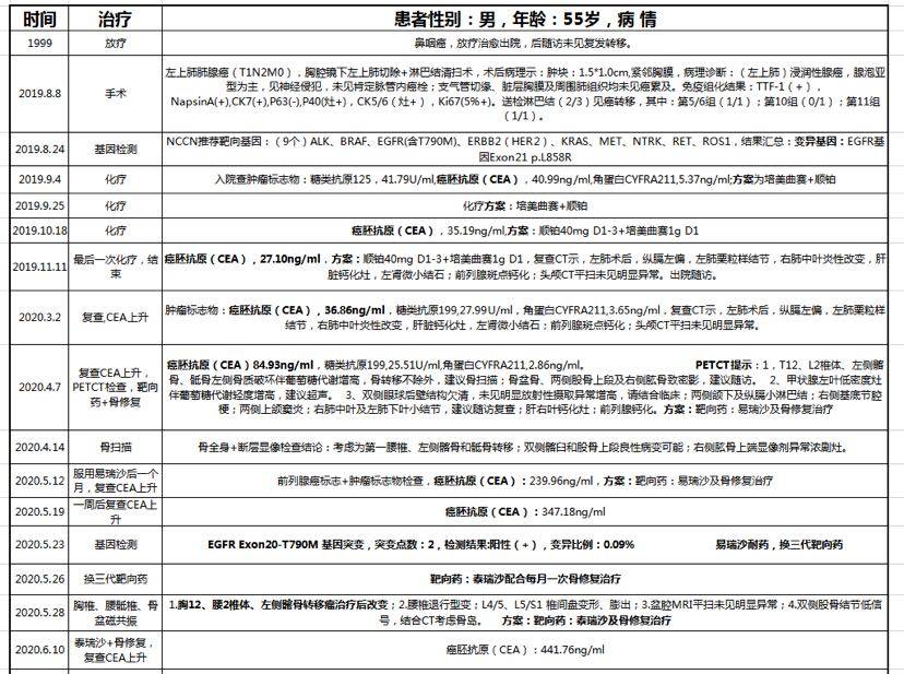 19年8月术后3A期,化疗四期出院空窗,基因检测9个基因,EGFR基因21p.L858R突变,3月后复查,多发骨转,方案,吃易瑞沙+骨保护,隔一月CEA上涨,隔半月复查还是上涨,抽血基因检测T790M阳性,换方案吃泰瑞莎+骨保护,复查CEA还是上涨,医生建议拿之前手术的组织再次做个全面的基因检测,想问下,1.还是拿手术的组织去做基因检测会不会不准确,怕隔这么久了现在身体里的基因已经变化了。 是不是骨转移的地方能穿刺做基因检测?2.还有没有什么好的治疗方案?谢谢大家。
