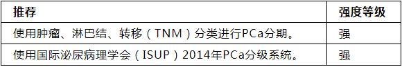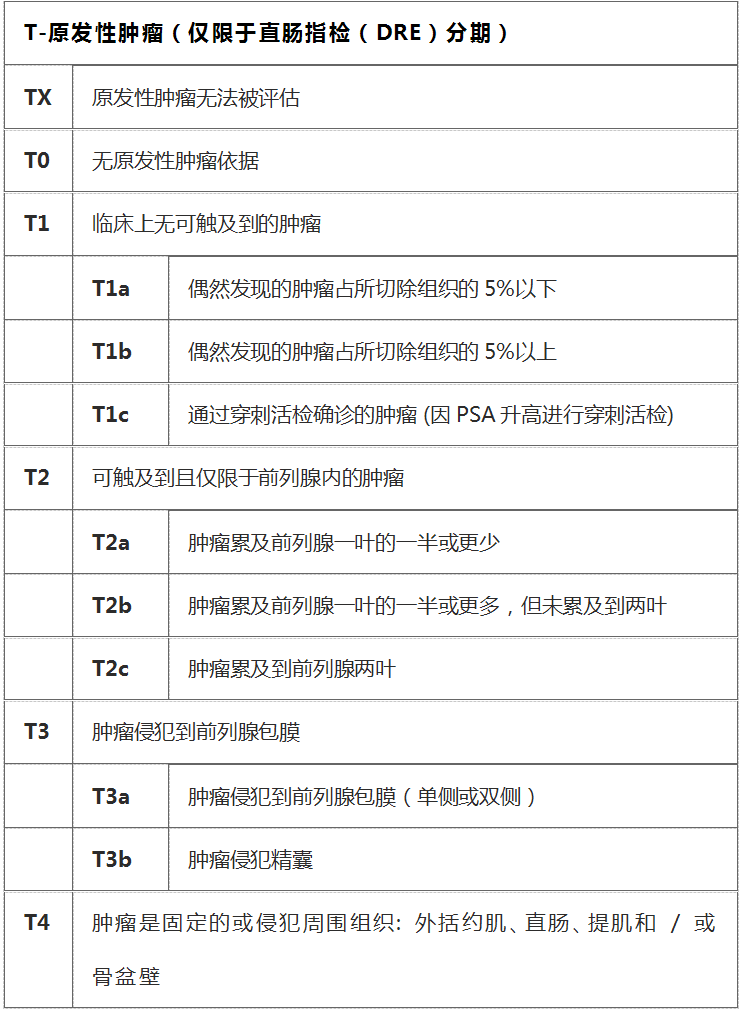 临床T阶段仅指DRE表现,TNM分型不考虑影像学表现。病理分期(pTNM)基于组织病理学评估,与临床TNM大体相似,但是临床分期T1c和T2亚期除外。经组织病理学证实,RP后所有局限于器官的PCa均为T2期,目前国际癌症控制联盟(UICC)已不再有pT2型。