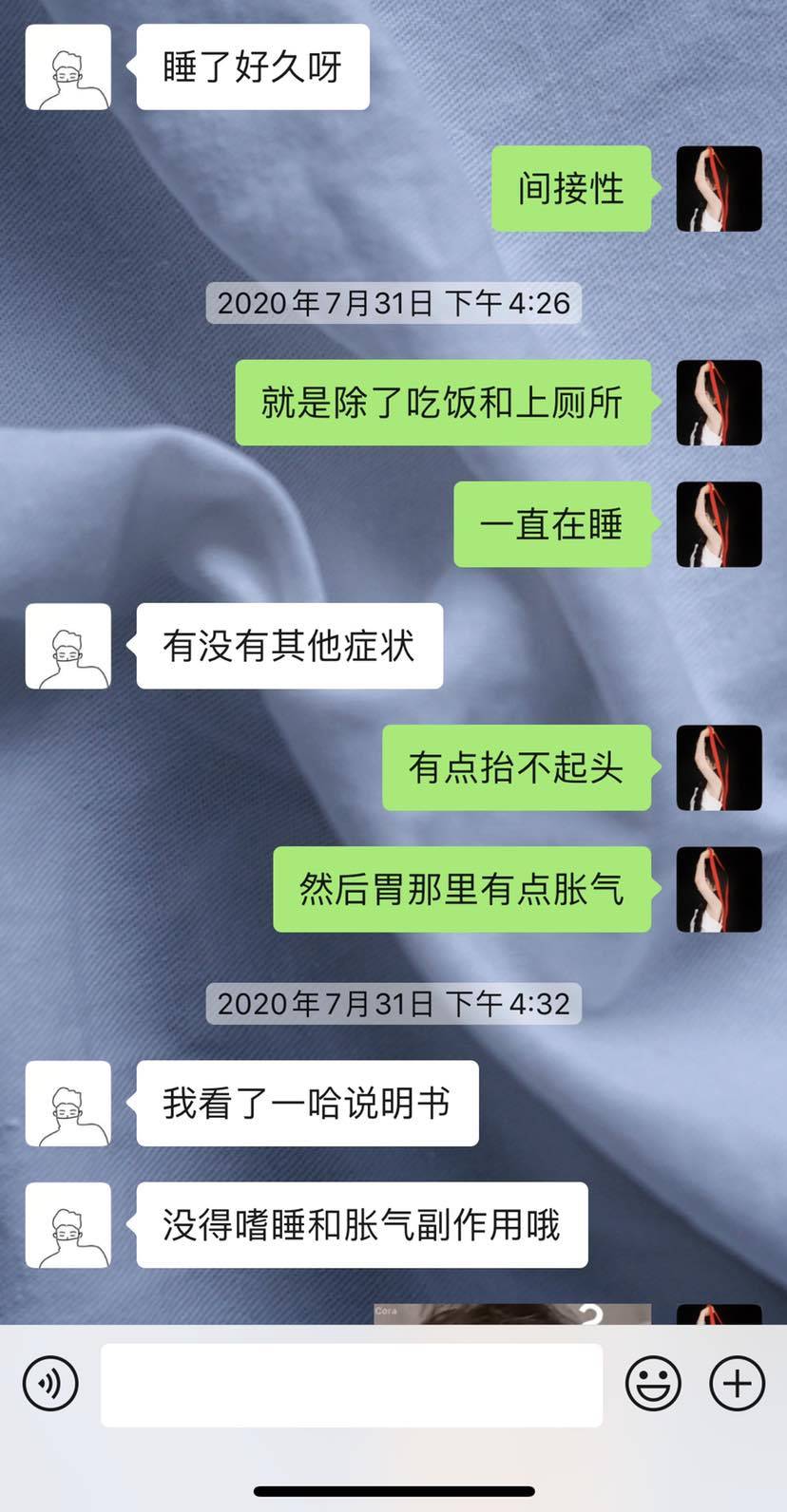 8月1日至8月16日爷爷一直处于嗜睡,毫不夸张的说爷爷除了吃饭就一直在睡,而且食欲明显下降,根本不想吃任何东西,便秘,甜的东西一点都吃不了,嗅觉和味觉也出现了变化。精神非常的狂躁不安,整个人就像换了一个人一样。我咨询医生,医生没有给我回复,我只能去问药代。下面是药代给我的回复。我觉得它他像个SB