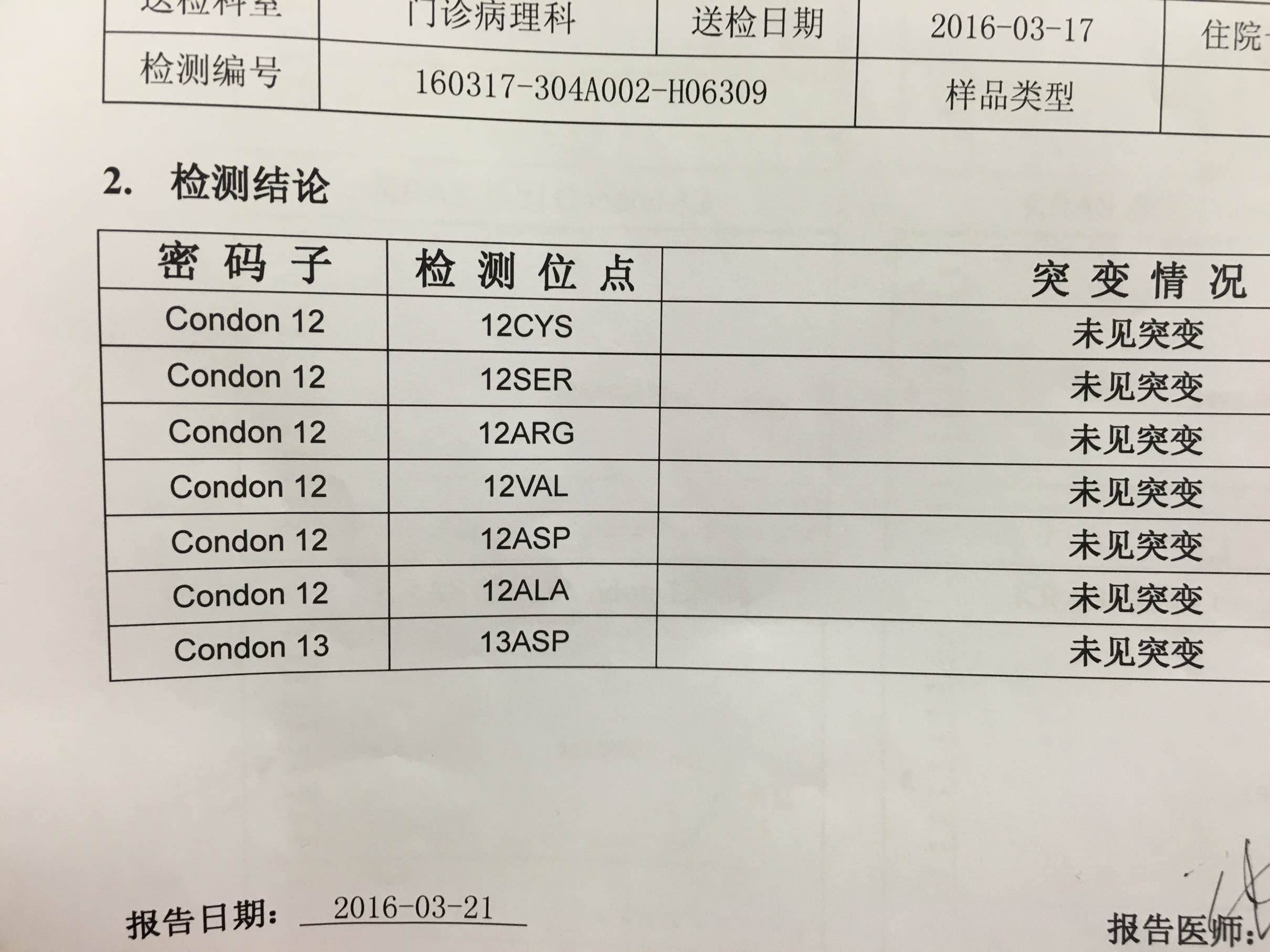 母亲3月8号查出肺腺癌,果断来北京进一步详查,初入这个圈子,起初实在是不知所措,天天以泪洗面,偏偏又不能让母亲知道,个中滋味相信各位家属深有同感,我只有默默接受,调整好心情陪她一起面对,这是Egfr和kras的结果,特请教各位。不胜感激。