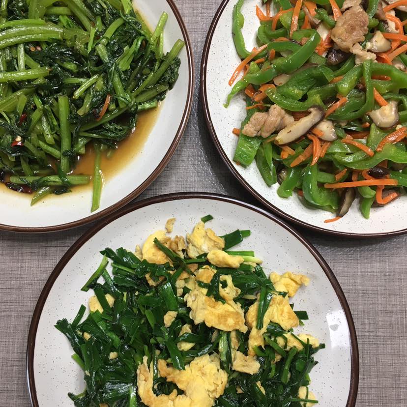 炒茼蒿/韭菜炒蛋/青椒肉丝炒香菇🥕