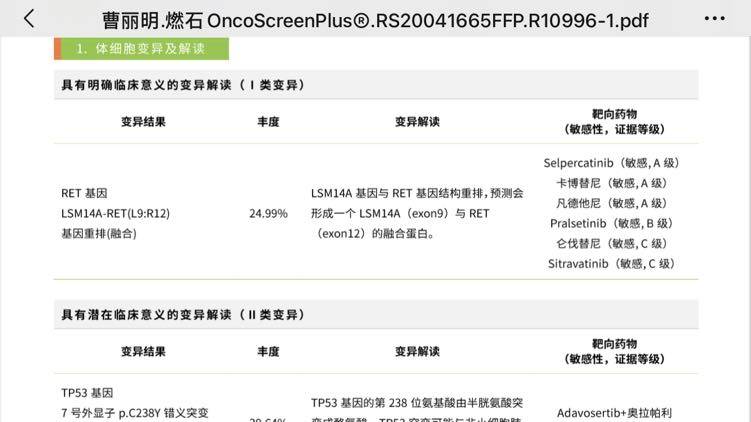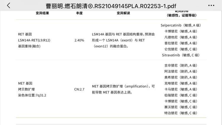 患者52,女,2020.4确诊,5、6月份培美➕卡铂➕信迪利 无效,8、9月份白紫➕顺铂➕贝伐,无效,10月份血栓手术, 2020.11开始292yl至今, 2020.8做的基因检测ret融合(重排)➕tp53,2021.6肝部进展,今天血液基因检测出来(组织还未出),ret丰度由27.99→2.4,同时出现met扩增(扩增倍数2.7)➕kras(丰度17.13),现在吃有:292➕利伐沙班➕降压药 ➕奥施康定,突然多出两个,有点不知所措。1,化疗,还可以用什么药物可以压制住呢?2,292+184,两个都是ret,副作用可以承受吗,这种联用可行吗?3,292+克唑替尼/280,可还有kras,丰度这么高。 怎么做才是相对比较好的决定呢??前两张为刚做的基因检测报告,第三张为去年八月份的。