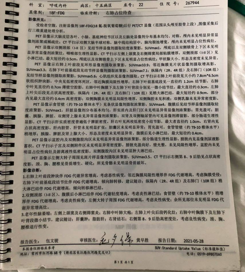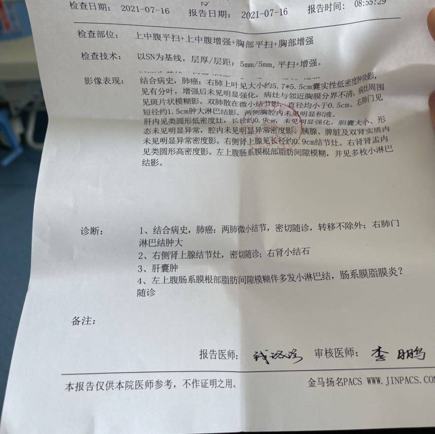 医生讲的模糊,我自己又去楼下打印了增强CT的报告单,和入院前还有petCT对比一下,居然多出来肾结节灶,肺内好像也很多小结节一时之间看不懂了,接下来怎么办呢,还答应妈妈马上就能回重庆治疗了,她还每天每天都盼着,只能先吃吃药看下肌酐降不降吧……什么降期手术大概都是我的幻想