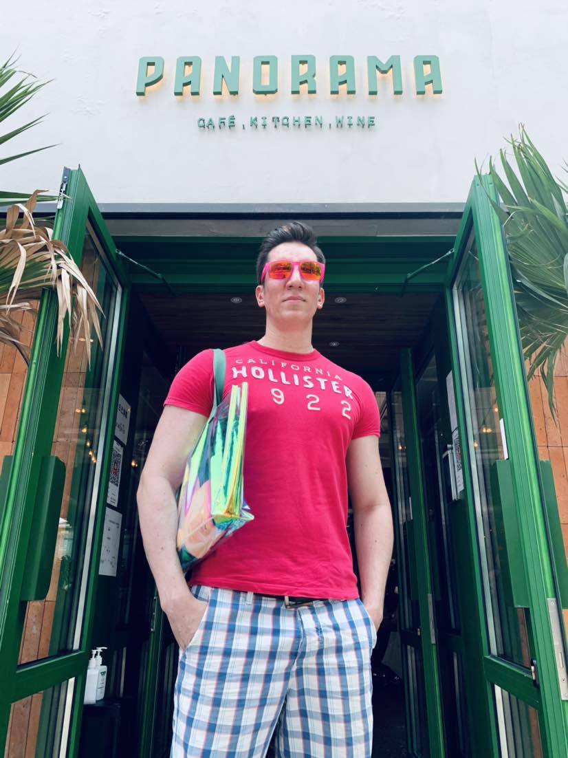 这个包包很飒。眼镜很炫。整体望去,果然是个潮男。