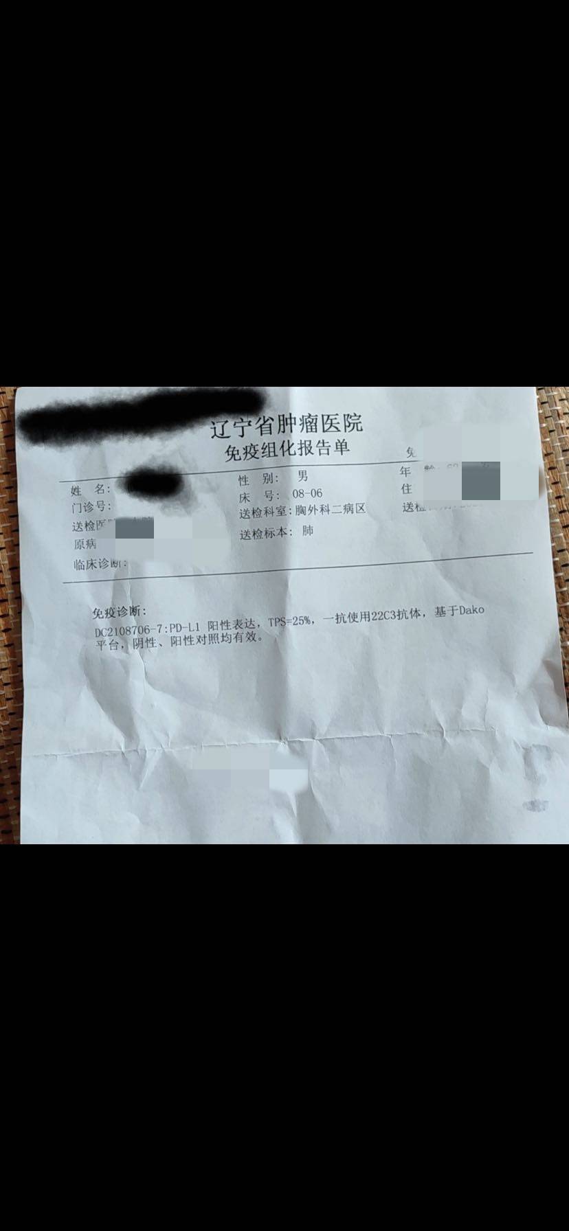 这是一份免疫组化检测结果报告单,显示为该患者标本经检测pd一L1免疫表达为阳性,表达值为25%,属于免疫低表达。