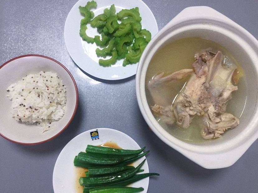 老母鸡汤(主要吃肉)、秋葵、苦瓜
