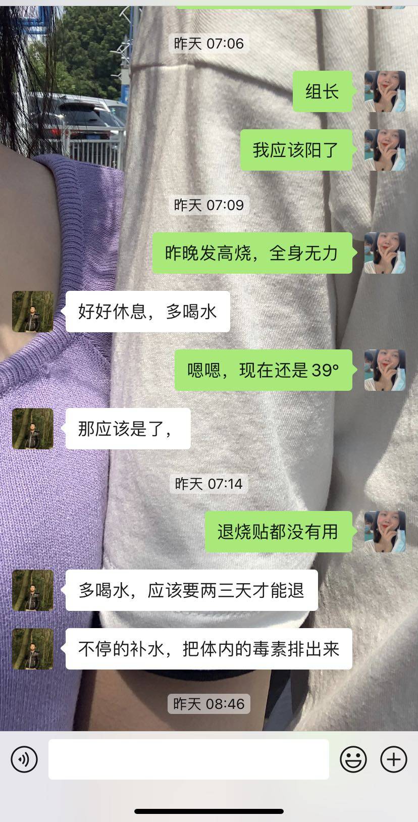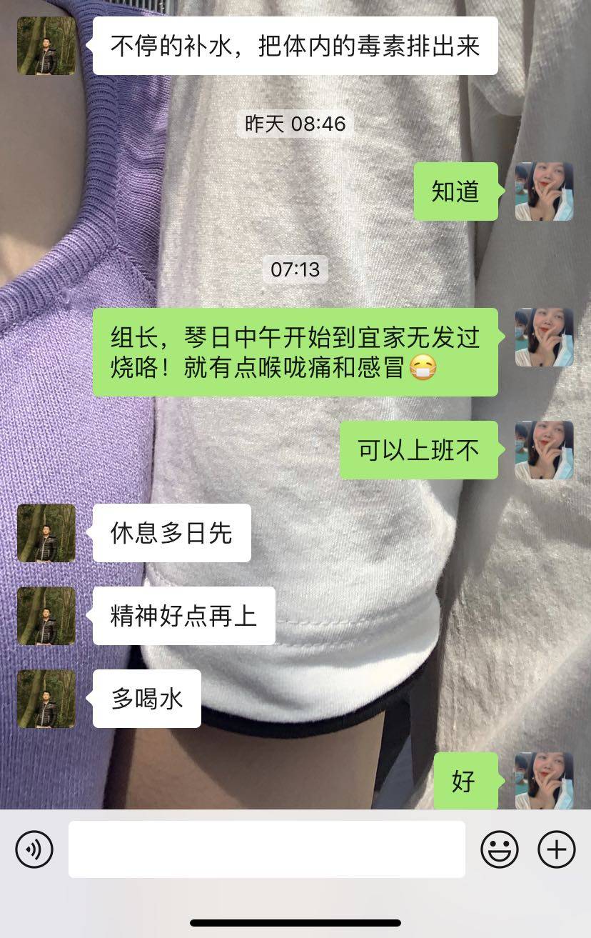感冒一周左右,喉咙痛两三天,12.18早上来大姨妈,接着到中午吃饭睡醒后有点头疼没什么力气,到5点下班回家洗澡睡觉醒来7点左右测体温38°然后继续睡觉😴很快就醒了再测体温39°退烧贴9点左右起来吃了个面继续睡觉😴这个晚上过得很漫长起来上厕所🚾无数次,每次上完厕所都看下手机12多1点多2点多3点多.......真的可以说是一小时醒来上厕所一次。到早上6点多发烧还是39°,拿手机给领导发信息请假,大慨10点左右吧退烧了到现在都没有复发过发烧🤒,早上我男朋友出门上班前我让他给我煮了一大锅白粥,我吃了一天。其实喝水都喝饱了都感觉不到饿白粥也是没有怎么吃的到了晚上还倒了很多,还煮了个饭炒了个瘦肉土豆片荠菜瘦肉汤。虽然不烧了但是还是有点咳嗽感冒😷还是得多喝水。12.20给领导发信息说我昨天到现在没有发烧了可以上班不,但是领导应该是怕我的让我休息多一天精神好点再来上班。