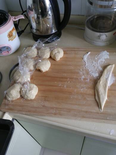 7. 发好的面团取出,排气好平均分成6份,滚圆盖保鲜膜松驰15分钟。