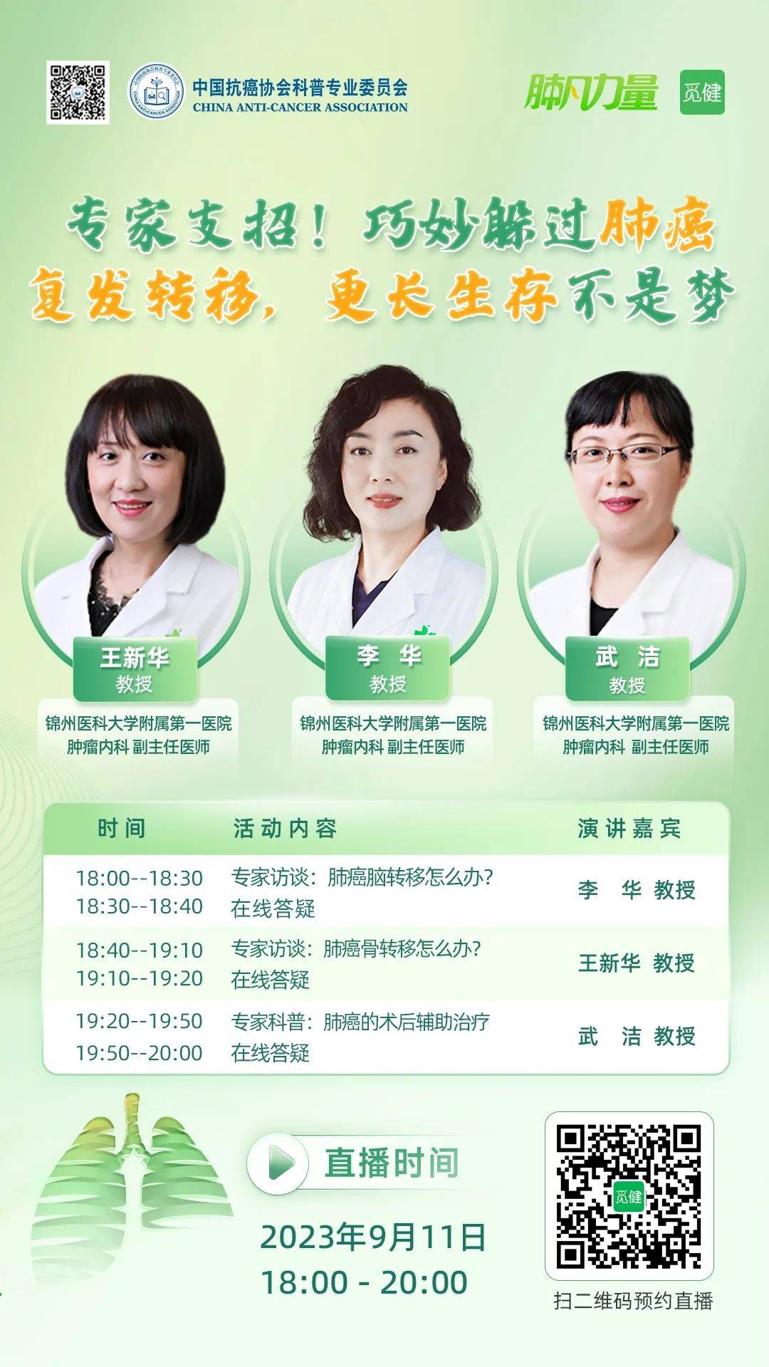在本次直播中,李华教授将为觅友们详细讲解肺癌脑转移怎么办王新华教授将为觅友们详细讲解肺癌骨转移怎么办武洁教授将为大家带来肺癌术后辅助治疗相关主题讲解,助力觅友们迈向长生存。
