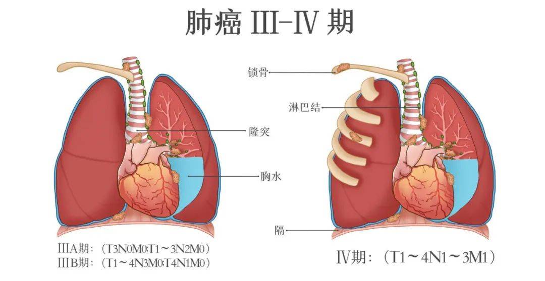Ⅲ期(ⅢA、ⅢB、ⅢC期):癌细胞数量继续增多,越跑越远,纵膈或肺外淋巴结已有它们的足迹。