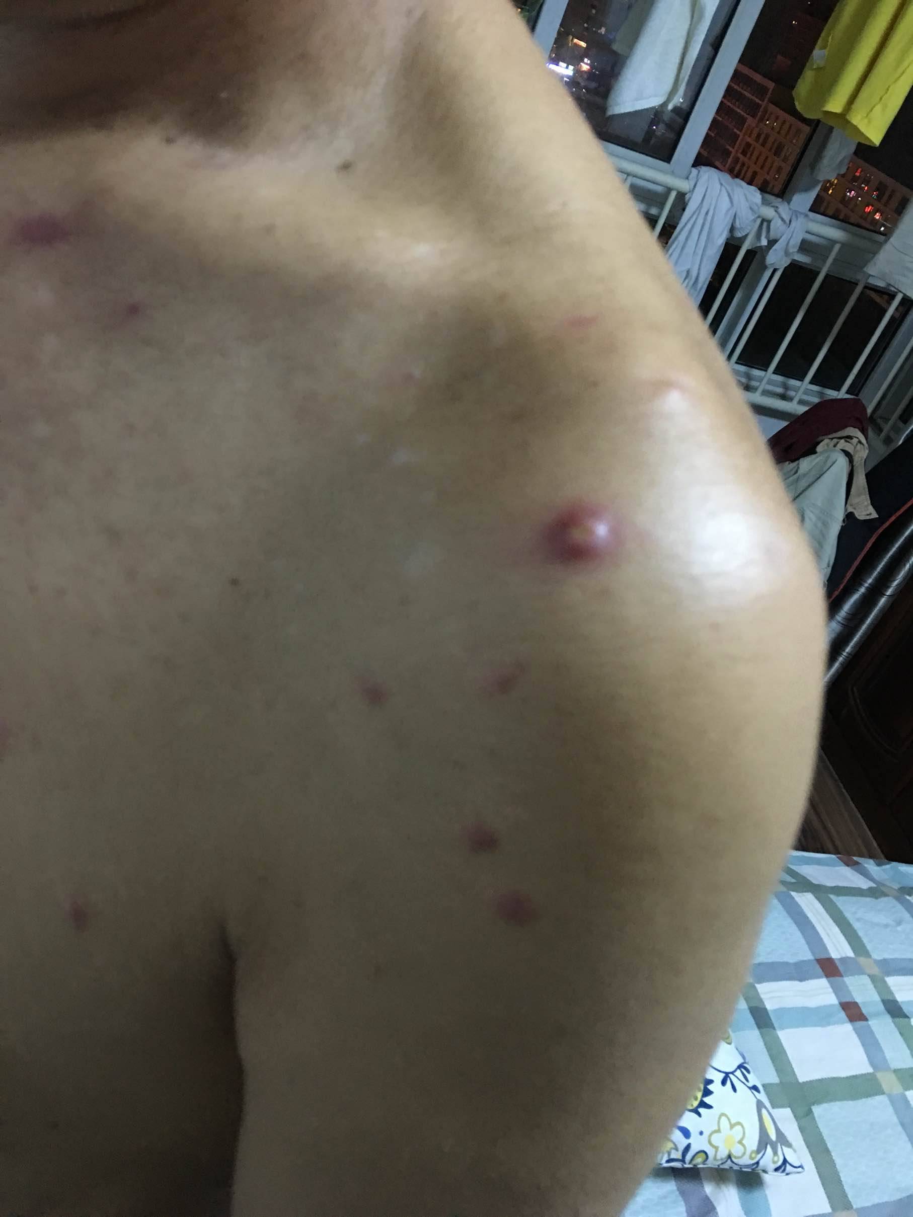 至今,又过了两三个月,身上就出疹子了,如图。不知道具体什么原因?去301看了下大夫,初诊为“急性痘疮样苔藓样糠疹”。