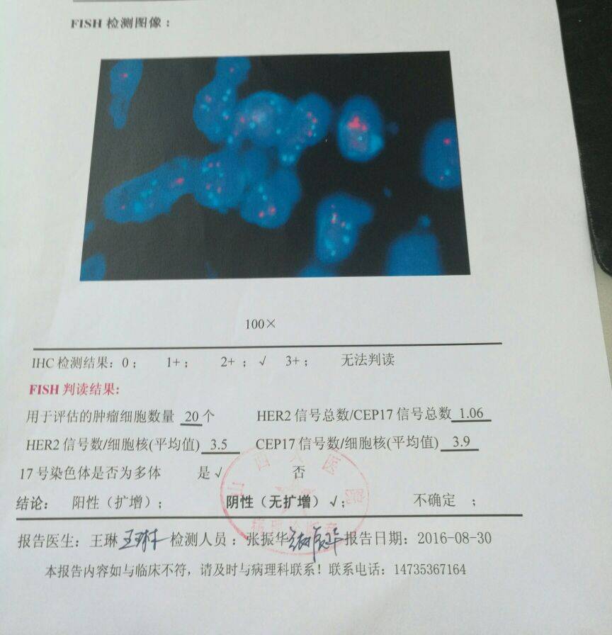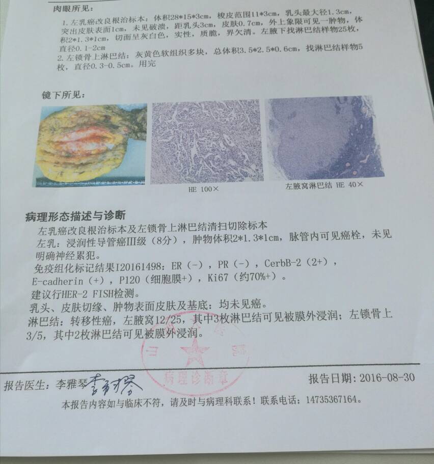 虽然早有预感,但9月2日病理结果出来,还是给我很大打击,是乳腺癌三级,三阴型的。虽然摊上了这个15%,还是要积极面对和治疗,我的好运和贵人一定还会继续眷顾我的,加油!!