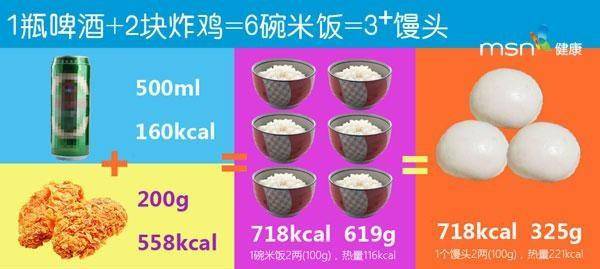 炸鸡是高热量高脂肪的食物,200克的炸鸡的热量就有558千卡尔,500毫升的啤酒的热量有160千卡尔,相当于6碗米饭的热量(以每碗米饭100克为例),也就说,两块炸鸡一听啤酒,718卡路里,相当于吃了六碗米饭!(“小看”注:千颂伊说的1552卡路里说明她一次要吃4块炸鸡2罐啤酒)