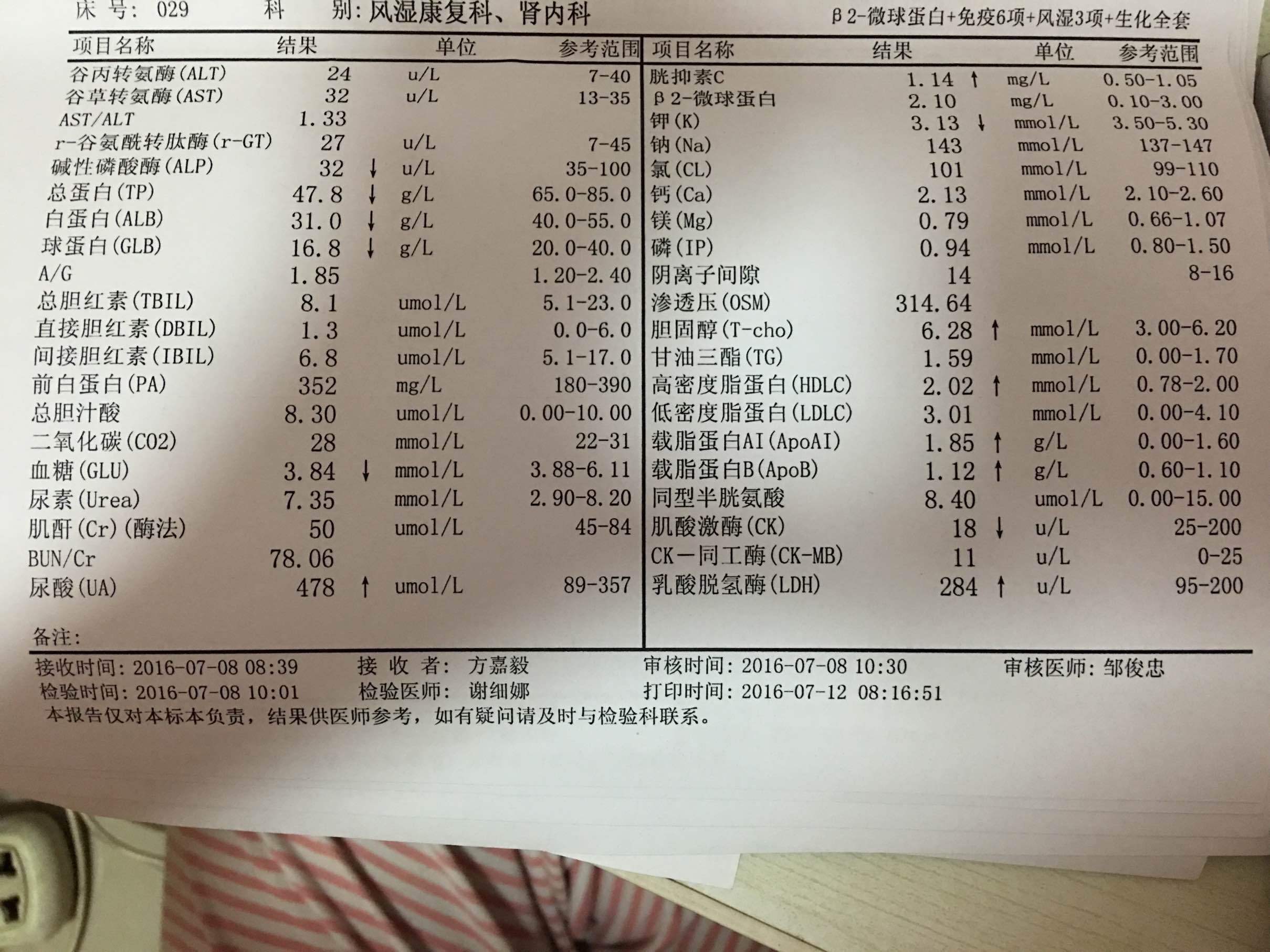 你这是出院后第一次复查吗?白蛋白低要多吃营养,尿蛋白要忌口,注意休息