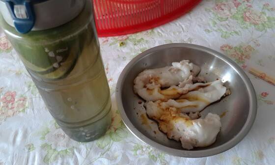 😂买了套肠粉用具,今天心血来潮,于是做了一份吃,还可以哦,滑滑的,做一次,我就够吃了!下次煮一煮酱油,会更好,这次没煮,有点咸了!!