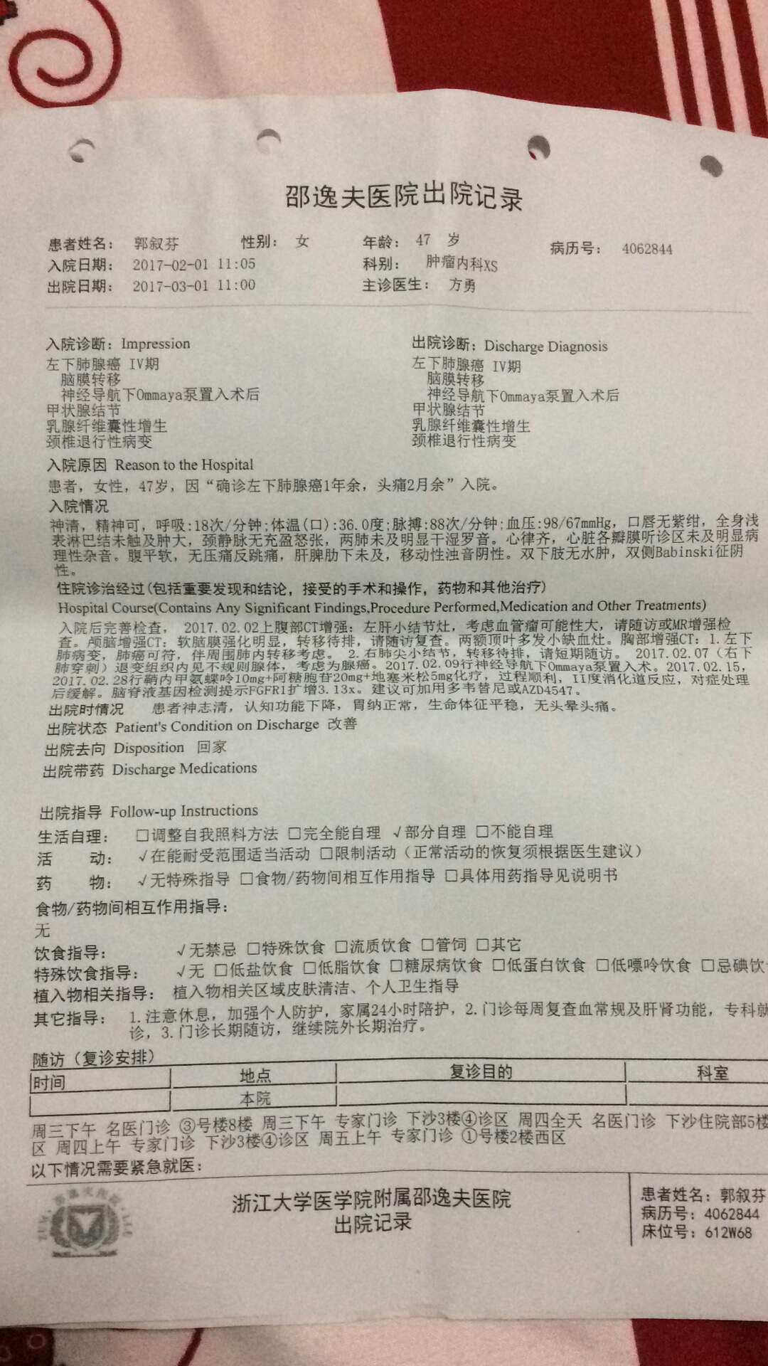 我的母亲2015年8月被确诊为肺腺癌,六次培美曲塞加卡铂化疗,2016年四月服用易瑞沙至今,十月份头痛,2月份被确诊脑膜转移,头上放了囊,鞘内注射两次,现在在家,医生让我们自己去买多韦替尼吃,我们现在不知道该怎么办