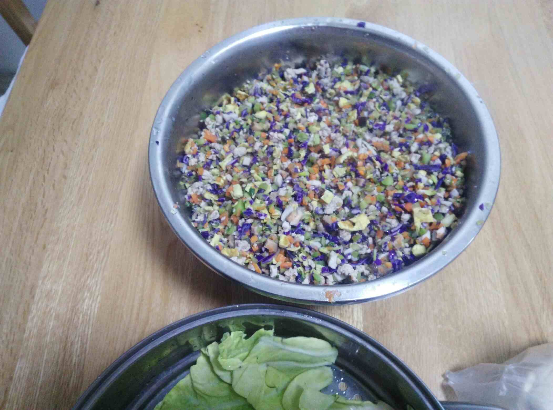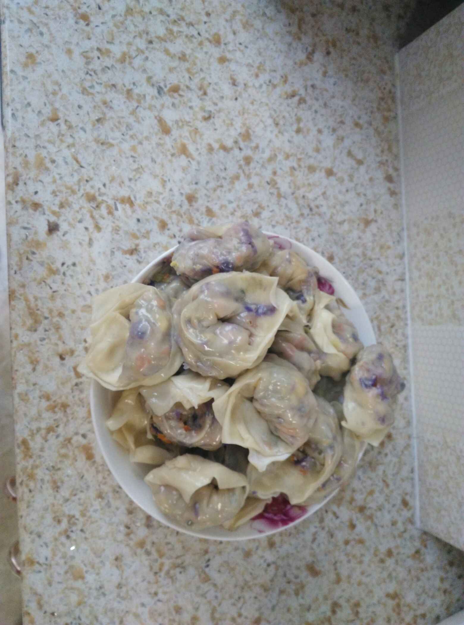 今天中午吃大馄饨,我准备的馅有肉,干香菇泡发,葫萝卜,卷心莱,紫甘蓝,莴笋,豆干,切碎的鱼丸,蛋皮切碎,还加了莴笋叶,家乡的大馄饨是馅要炒熟,再把切碎的蛋皮拌进去,馅炒好后凉凉再包,蒸熟特香,远方的姐妹有趣可尝试下。可加些虾仁或虾皮都好吃,如没有大馄饨皮可用大饺子皮包,蒸熟也特香!😃