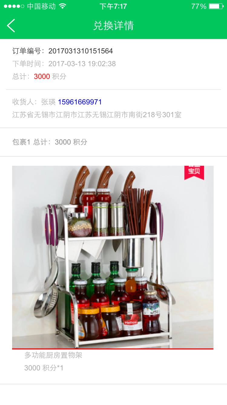 上次用积分兑换的″我和你六件套″准备送老公作生日礼物的,本月3号信息说己发货。可一直没收到。今天互助君说漏发退回了积分。看到兑换区有了新品。哈哈糗事变美事。换个更喜欢的多功能厨房置物架。再向新目标家用静音加湿器进军。