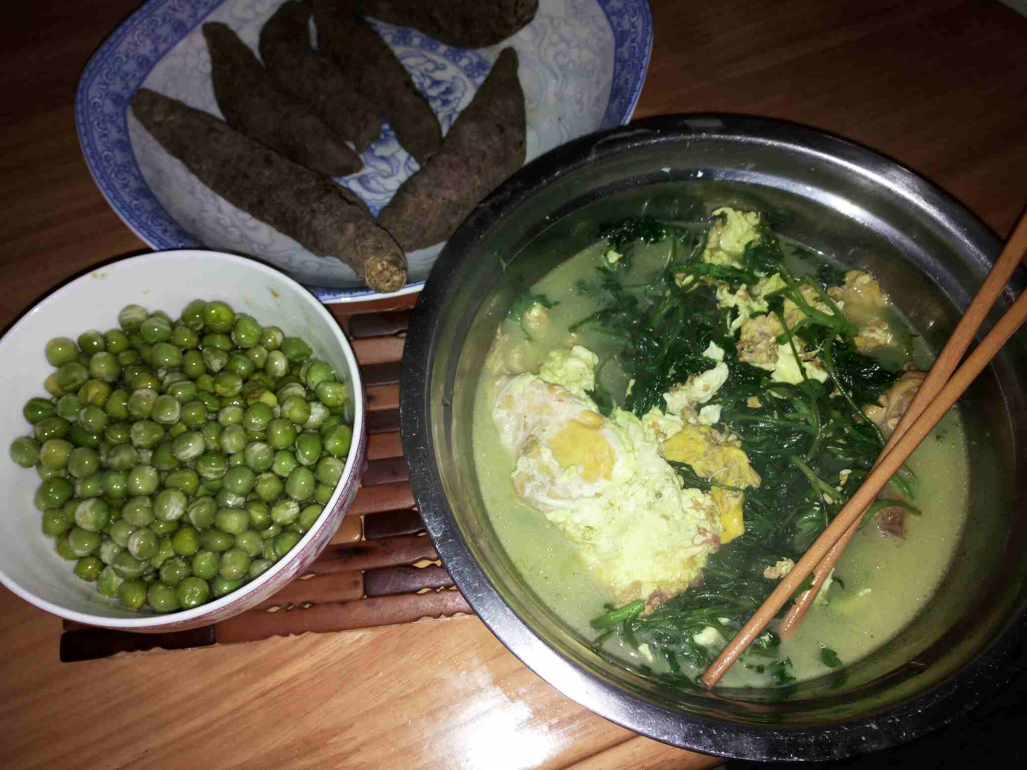 这就是今天的早餐练了瑜伽所以休息了一个小时才弄的。艾菜大家吃不吃我很喜欢噢!红薯烤的,冬豆炒的,开吃咯!