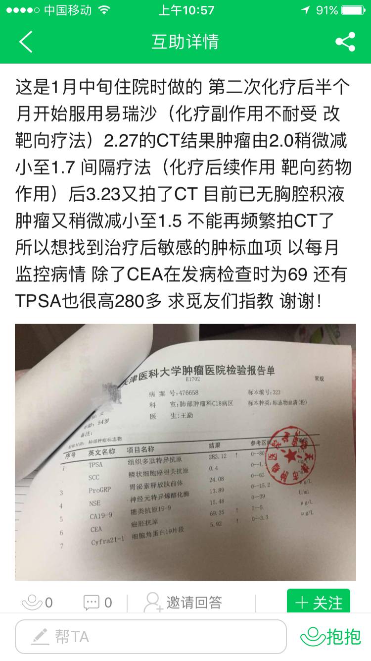 不能再频繁拍CT了 所以想找到治疗后敏感的肿标血项 以每月监控病情