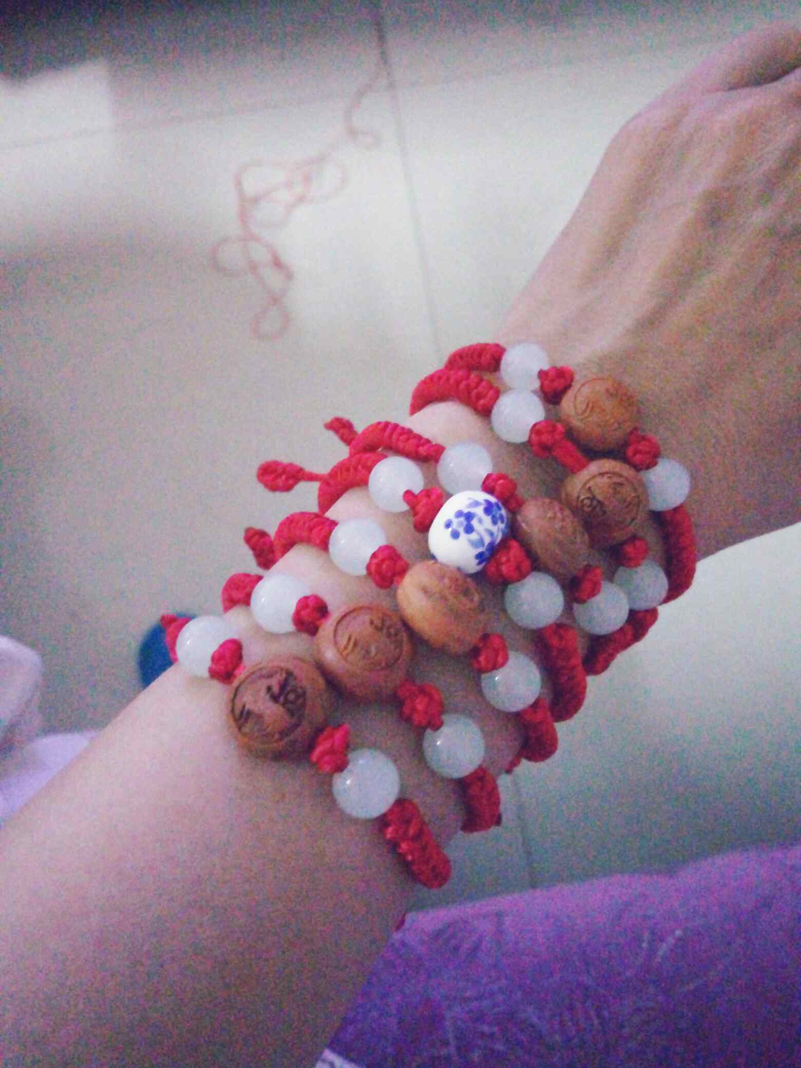 说好给女儿舍友的惊喜!今天终于完工了!有点小遗憾,本来打算编的四只羊,两匹马,一条蛇的生肖手链!可惜在穿珠子的时候一匹马“跑”了,明明就掉地上,可怎么找也找不到了!改用了一粒陶瓷珠,觉得也不错嘛!希望小美女们都喜欢!