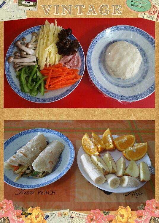 今天第一次做春饼,配菜里加了瘦肉丝,胡萝卜丝,土豆丝,青椒丝,木耳和菇,味道不错啊😜