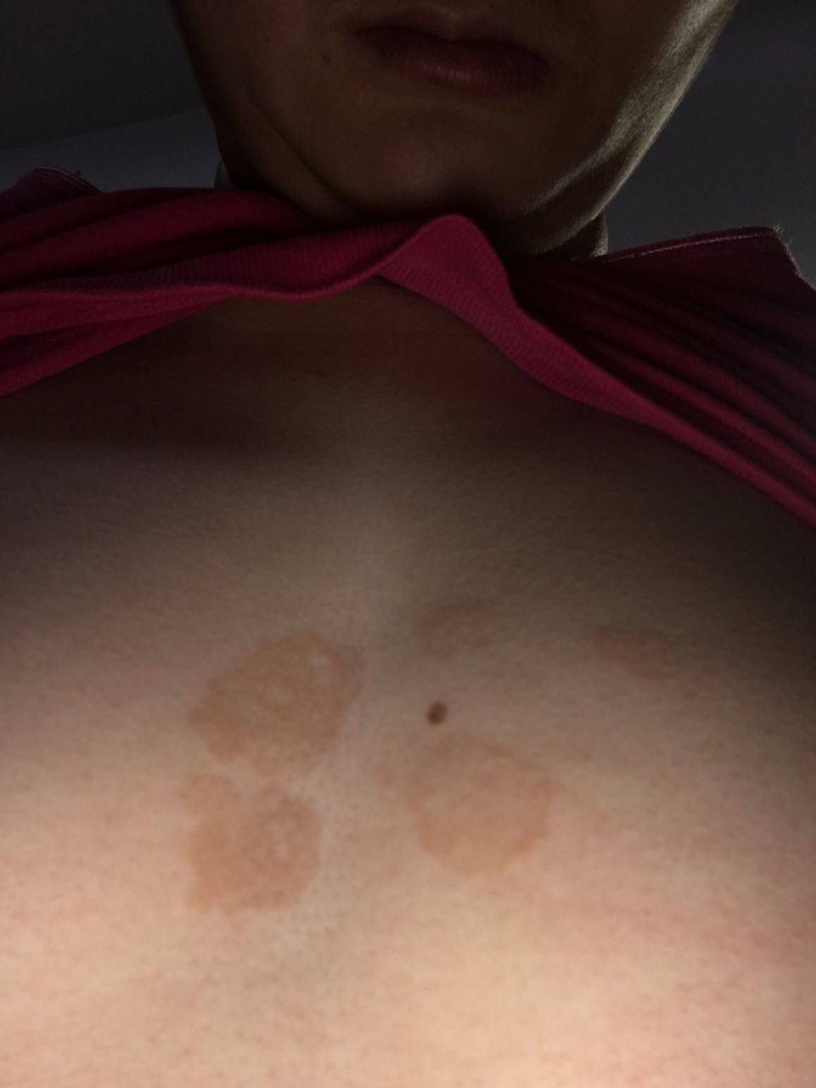 我胸口也有俩块,跟你这有点像,刚生病的时候有的,不疼不痒,到现在快一年了,没有大也没小,你身上这个问过医生吗