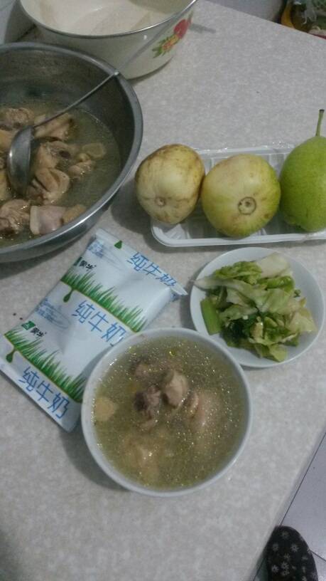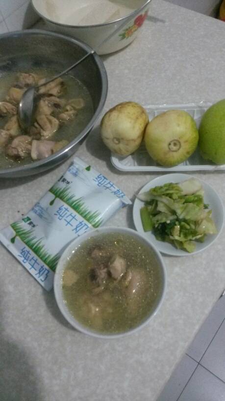 今天晚上我熬点鸡汤,还有米饭,一小碟咸菜,一代牛奶,吃完饭喝中药,我今天去超市买了好多菜,买了三个香瓜,我吃了一个,给老公留两个,吃完出去溜一圈,老公店里忙,九点多才回来,我一个人无聊,每天就是散步了,说说你们晚上吃啥饭了