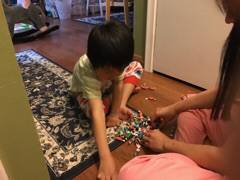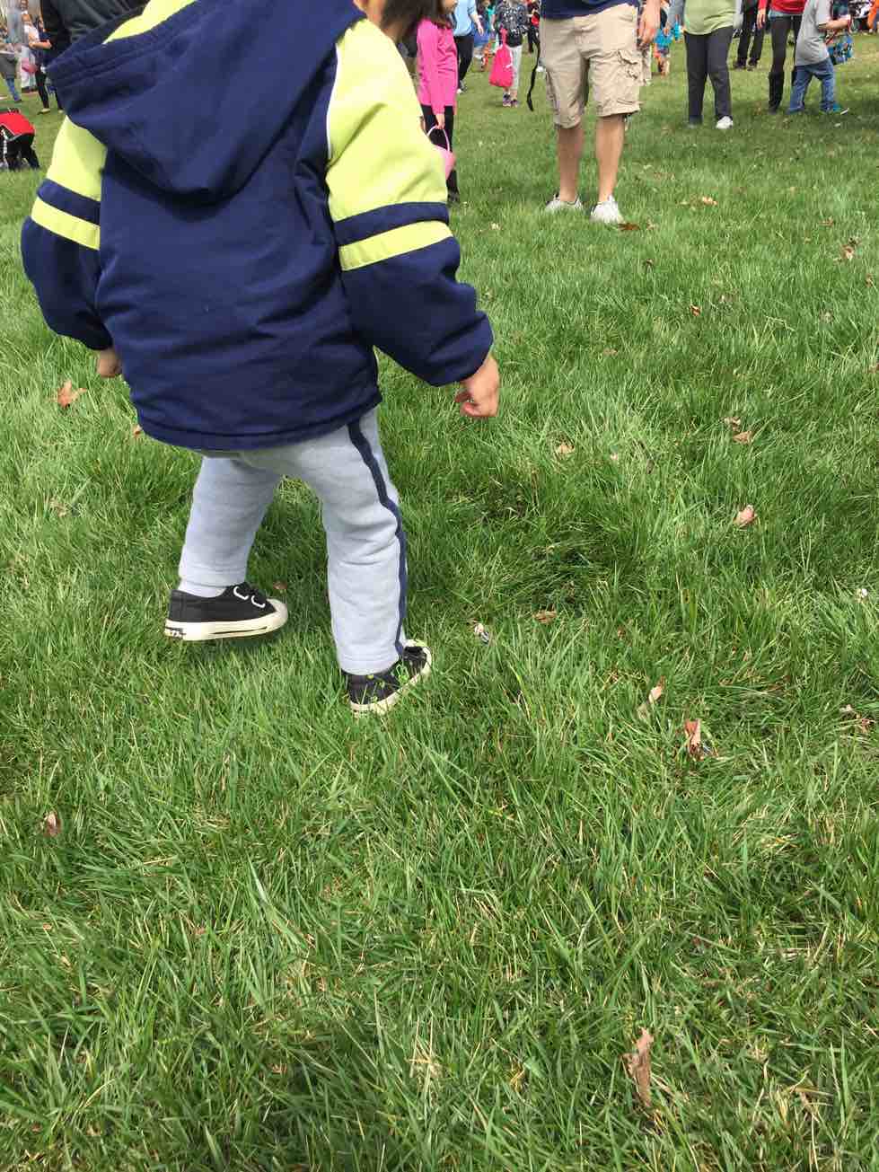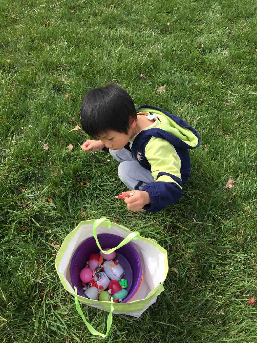 幸好这个开始是我听错了,我们和一起听错的人回到等待区。鹿鹿又开始玩车。真正开始的时候出乎我预料,鹿鹿开心地跟着所有人往里冲。迅速捡到一个蛋,然后立即捏开,把糖放进篮子。我一看急了,这样估计我们捡不到几个蛋了,带着鹿鹿跑。鹿鹿立即不高兴了,说要回去玩车。我看看四周,每个人都满满的一篮子蛋了,鹿鹿捏碎蛋用了很多时间。我跟鹿鹿说,你直接捡糖吧。草地上的糖是被捡蛋的小朋友漏下的。鹿鹿果真高兴地捡起了糖。