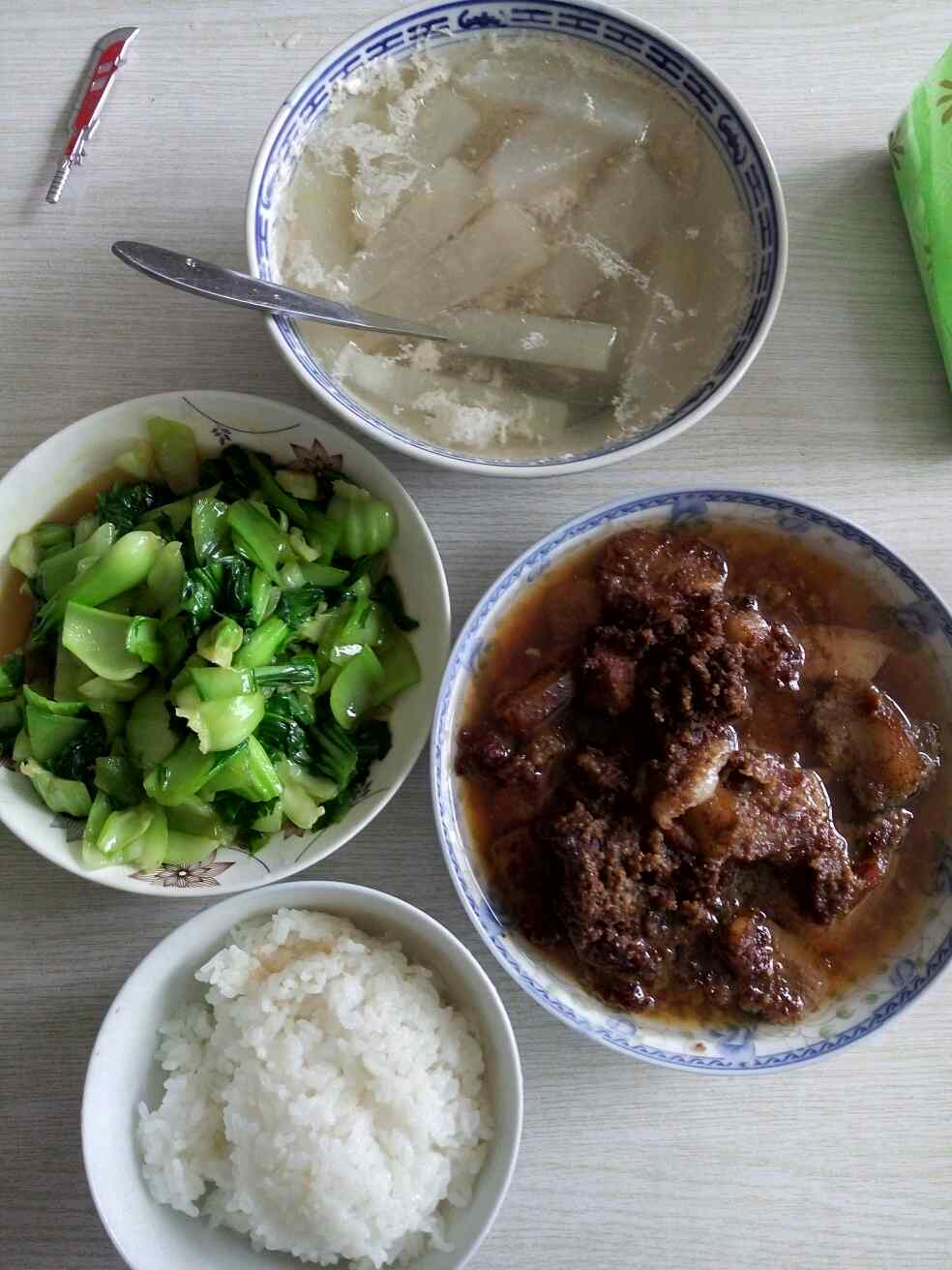 做个家庭主妇真可怜,做完饭没人回来吃,又的浪费了。冬瓜肉饼汤,粉蒸肉,炒青菜,他不回来他吃的菜没炒。粉蒸肉太美味了,入口即化,可惜不敢多吃。