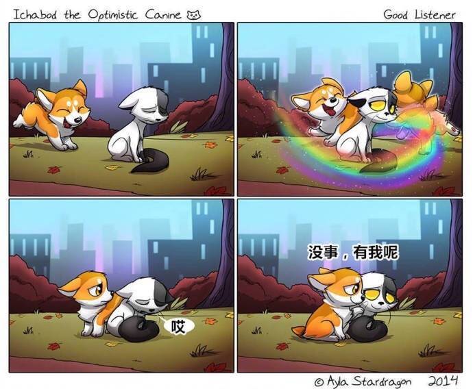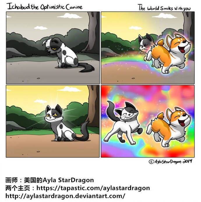 美国漫画师Ayla StarDragon的作品:这只汪叫Ichabod,是一条著名的正能量汪,永远积极的面对生活,把正能量带给周围的一切。。特别阳光