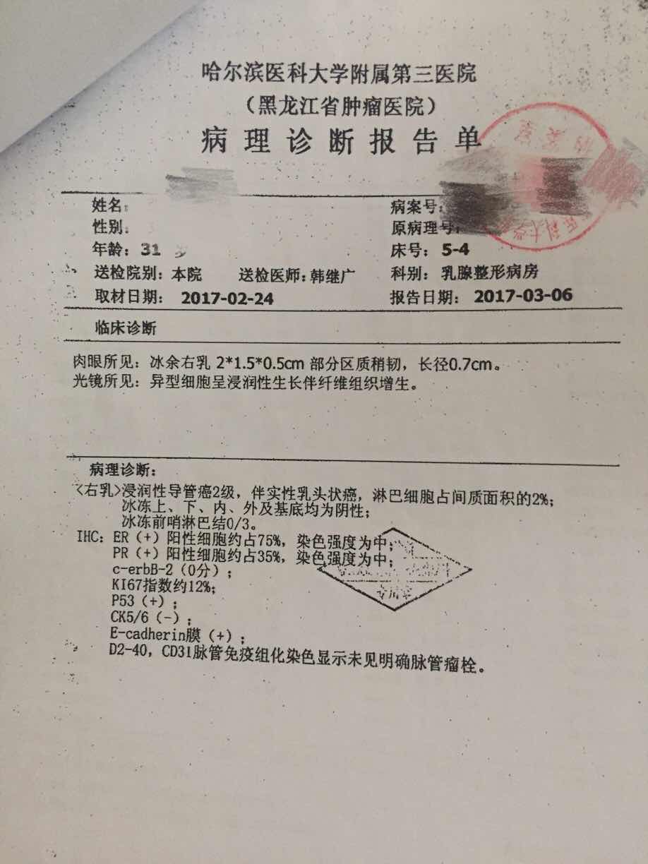 二阳一阴,ki67低,淋巴结未转移,估计可以不用化疗~