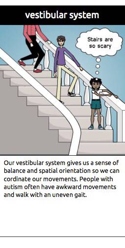 前庭系统处理我们的平衡感和空间方向感。因此我们可以协调自己的行动。自闭症患者常常行动笨拙,走路不平衡。