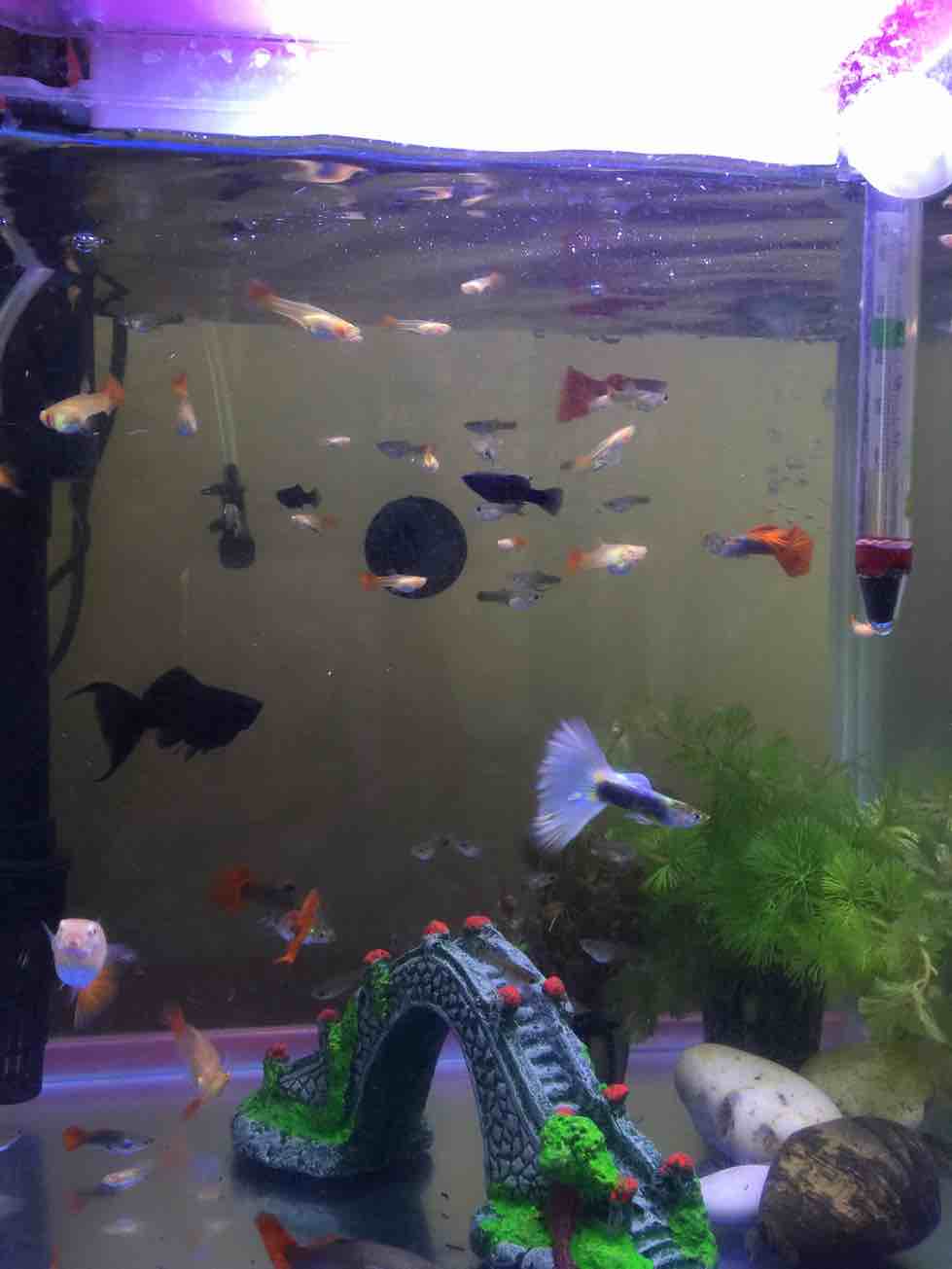 我的鱼缸增加了好多新成员,大的小的,红的黑的,好是热闹。这些小鱼都是我从他们出生开始养到这么大,每天必须看看他们,怕他们饿了,怕他们冷了,我妈说我对鱼比对人都好。