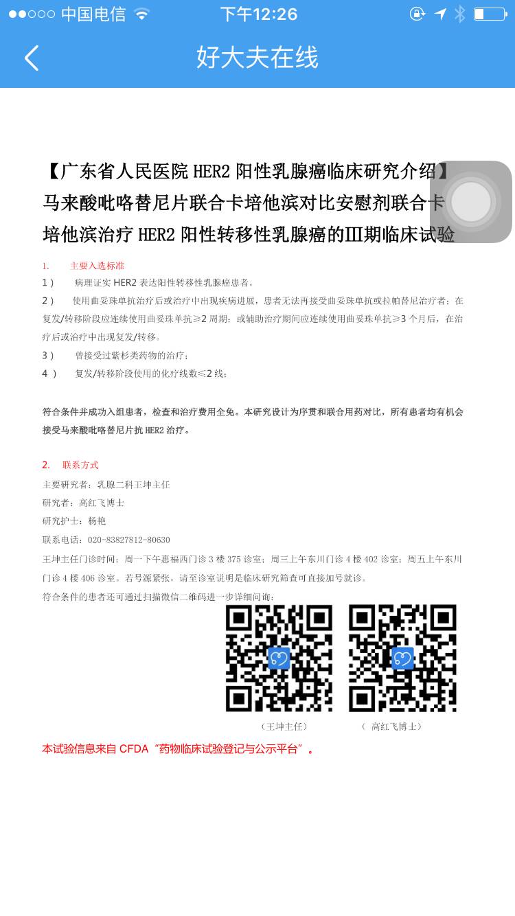 广东省人民医院目前正在开展HER2阳性乳腺癌临床研究,对于赫赛丁治疗失败的患者,若符合条件入组,治疗费用将全免,请大家留意告诉给需要需要的患者。