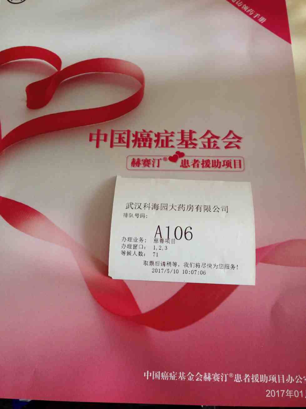 这个月入围赫塞汀赠药,今天适逢星期三领药的日子,去领药的药房体验,上午10点到,领号106,现场叫号34,病友告之下午3点再去,下午3点到,早上拿的号已过,只能再重新拿号。因打针时间在5月19日,预约到5月17日去,顺便也了解了一下首次领赠药需要准备的资料。整体感觉就是需要打这个针的人还是很多的。