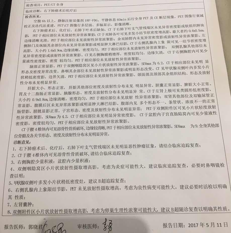 去年9月术后,紧接力比泰 卡铂四次化疗,三个月后腰椎疼痛医生建议做PETCT拿到结果显示身体出现了很多乱七八糟的毛病,主治医生说其他问题不大,就是腰椎出现了转移,现给我一些建议:1、打骨水泥、2、打肯转针、3、化疗两次后再做评估。我想盲试靶向药,医生说我当时做的14个靶点的基因检测,只有一个显示阳性又是耐药,盲试应该不理想,接下来该如何走?求好心人帮忙拿个主意,谢谢!