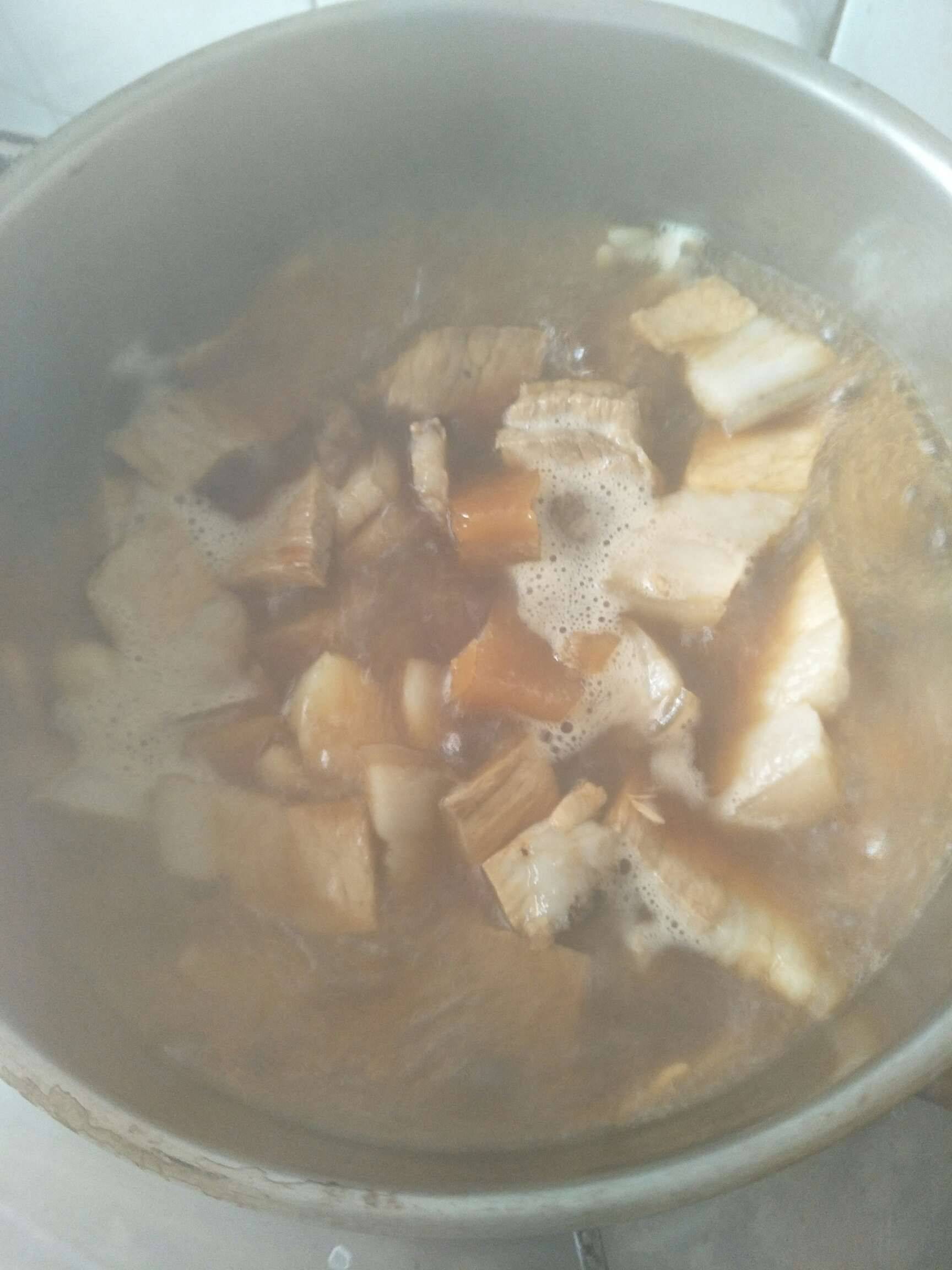切片,拍几个蒜头,爆炒一下(会更香),然后放水,刚好泡过肉,放酱油,蚝油,一点点料酒,一块小黄糖,煮一会。